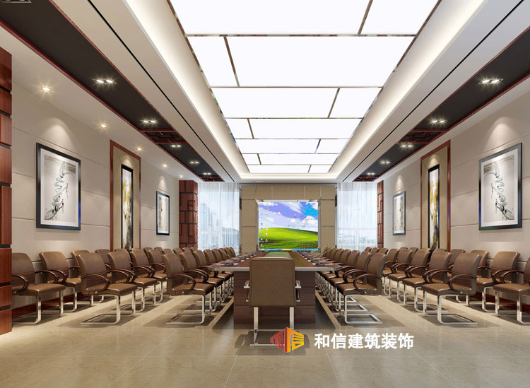 中式多功能會(huì)議室色彩搭配以深色為主,色彩濃重而成熟,一張長(zhǎng)方形會(huì)議桌,大家圍坐著,可以很多人同時(shí)與會(huì),總結(jié)會(huì)、公司團(tuán)建、茶話會(huì)、交流會(huì)都可以在此進(jìn)行。