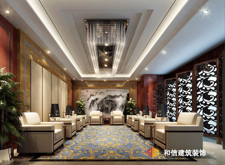 前廳空間融合了莊重與優(yōu)雅的雙重氣質(zhì),色彩上以黃色為主色調(diào),將傳統(tǒng)風(fēng)韻與現(xiàn)代的舒適完美地融合在一起,空間以簡(jiǎn)單的線條表現(xiàn)出中式的古樸大方,大理石質(zhì)感的前臺(tái),無(wú)論是色澤還是造型,都為空間提供美觀性和實(shí)用