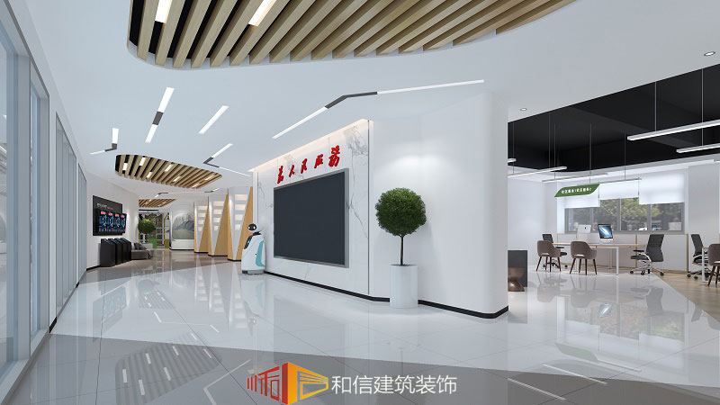 辦事大廳黑白空間碰撞,大面積窗戶將外面的自然景觀引入,給人以清新的感覺,簡潔、醒目,休閑區(qū)巧妙地將空間分為兩個功能區(qū),流線展示合理引導(dǎo)觀眾路線,讓人感受空間變化的魅力。