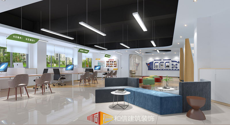 便民服務(wù)中心整個空間以暖色調(diào)為主,營造一種具有開放性、親民性、視覺性的特色空間格局,原木地板紅、藍、綠等亮色想碰撞,配以鏤空造型的燈具,營造出明亮的空間氛圍,同時也豐富了空間的層次感。