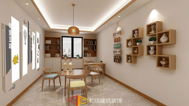 接待區(qū)整個空間為原木色調(diào),令人向往的溫暖空間,色彩和紋理和諧交融,簡致純粹的自然底色,舒適溫馨而不失格調(diào),置身其中,觸摸著原木質(zhì)感的家具,嗅著原木質(zhì)樸的芳香,看著滿眼溫暖的木色,人們在這里看書、休憩、鄰里喝茶,彰顯出一種返璞歸真的氣息。